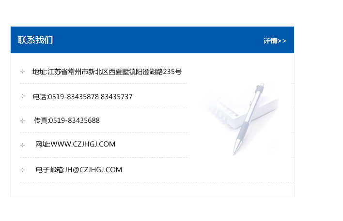 地址:常州市新北區友邦商務大廈1幢16、17層  電話:0519-85101652  傳真:0519-85112595  郵編:213022  網址:www_cz-jiayue_cn.sanjinoa.com  郵箱:xiajifengaa@163.com